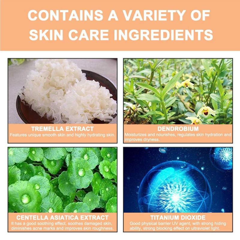 - Natural Plant Formula- Contains a variety of natural skin care ingredients, such as Centella asiatica extract, Tremella extract and so on. It also nourishes the skin while applying makeup.