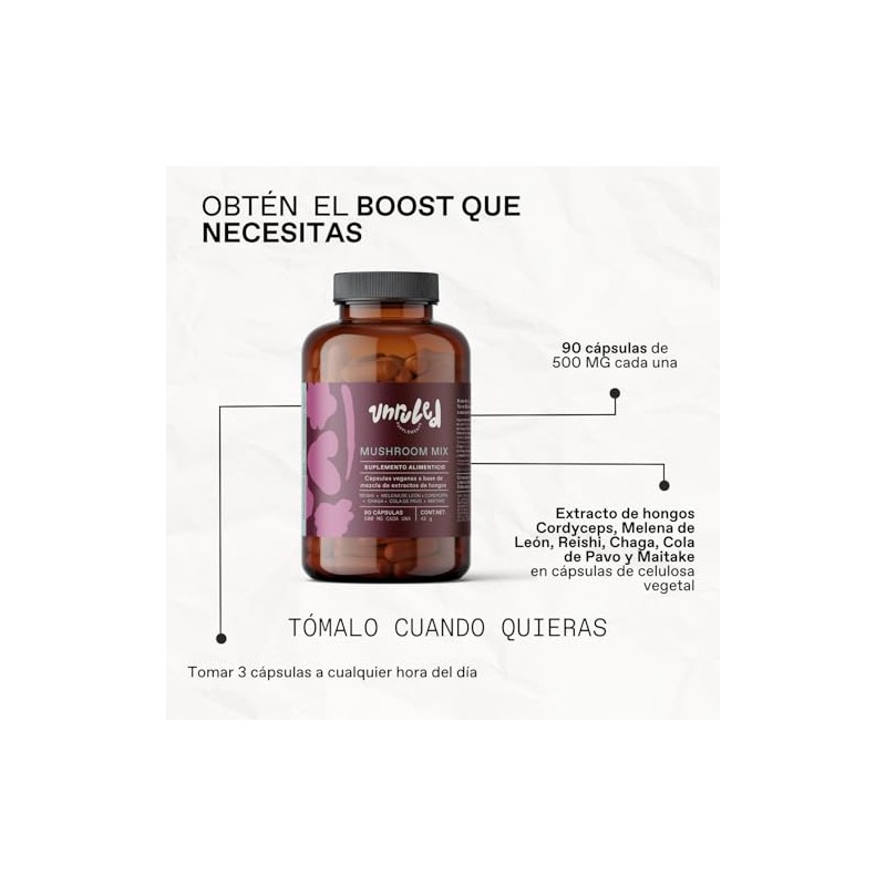 - Soporte Completo en 1 Cápsula: Si eres de los que quiere todo en 1, ¡prueba el Mushroom Mix de Unruled Foods! Este producto incluye todos nuestros hongos adaptógenos (incluido el hongo melena de leon) en una sola cápsula. Es ideal para quienes buscan un soporte completo físico y mental en su día.