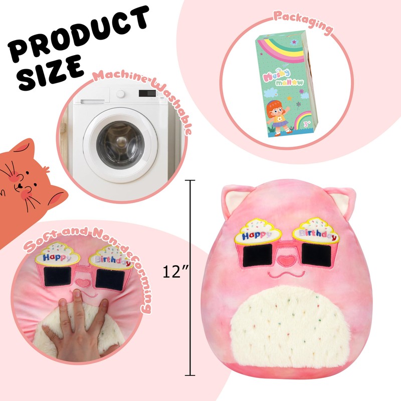 Mushymallow 12” Birthday Cat Plush Pillow Happy Birthday Kitten with Sunglasses Pillow Soft Cat Stuffed Animal Cute Kitten Plush Toy Birthday Gifts for Kids Girls