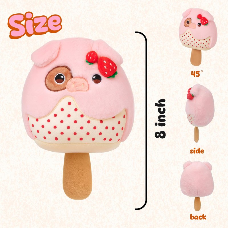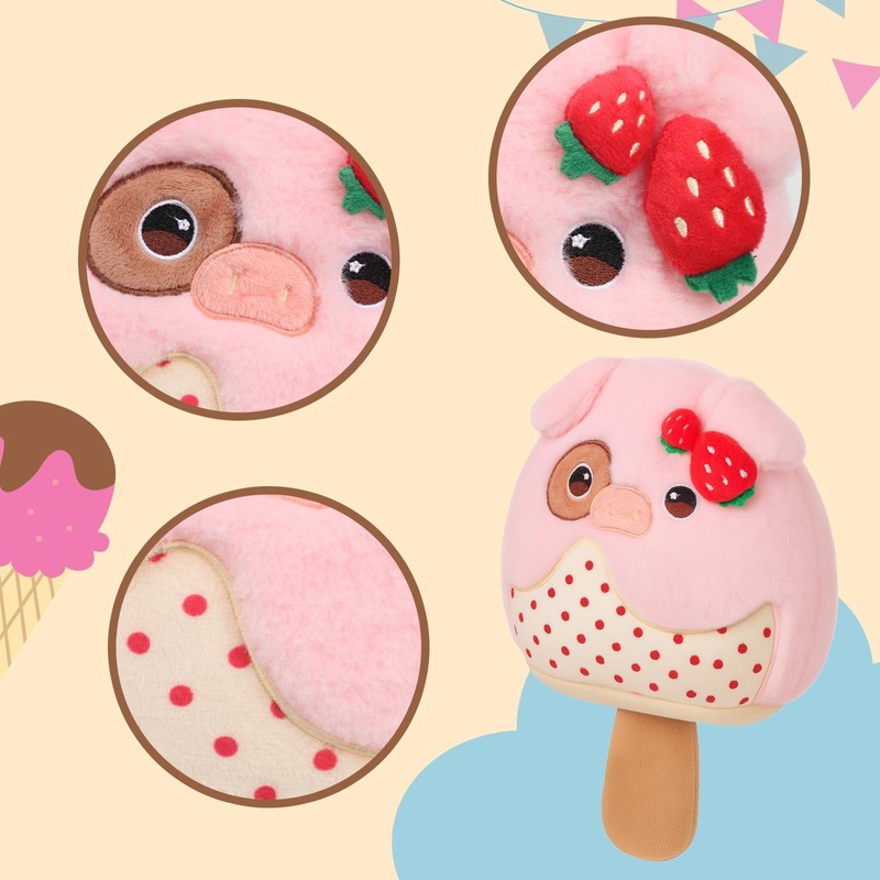 - CUTE DESIGN: This soft pillow combines a cute piggy and ice cream for a unique plush experience. The cute strawberry details on the piggy's ears add a playful touch. It's so adorably designed that you can't help but cuddle it and rub it and squeeze it and play around with it.