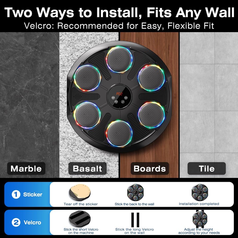 - Adjustable Height & Easy Installation - Set it up your way with two convenient installation options—no drilling required! This Music Boxing Machine is designed to save floor space while delivering rock-solid stability and safety during your workout. Effortlessly mount it in your living room, bedroom, garage, office, or any other spot that suits you. The height-adjustable feature caters to all body sizes, making it the ultimate multi-functional addition to your home gym
