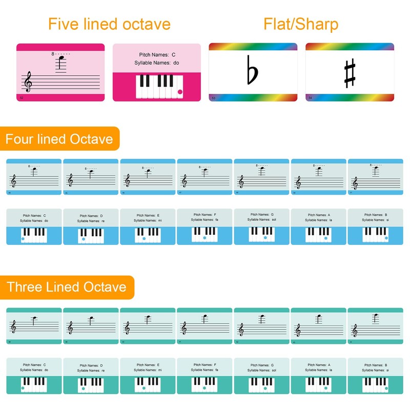 - 【Learning Music Notes & Symbols】Music flash cards feature double-sided and color-coded designs. Contains Sub-contra octave(1-2)contra octave(3-9) great octave(10-16) small octave(17-23) two lined octave(31-37) three lined octave(38-44) four lined octave(45-51) five lined octave(52) flat/sharp(53-54).