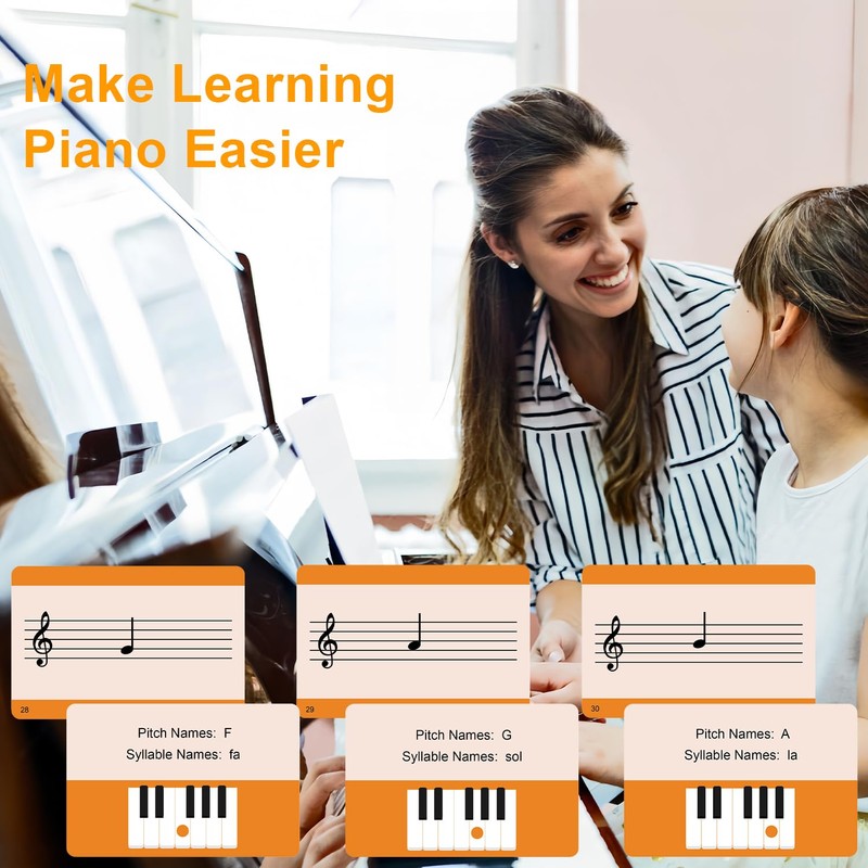 - 【Easy to use】These cards use easy-to-read fonts and bright colors to make music learning more fun. This set of flash cards come with a clear packaging box, easy to store and carry. Simple keyboard illustration at the bottom to help identify the note on a piano keyboard.