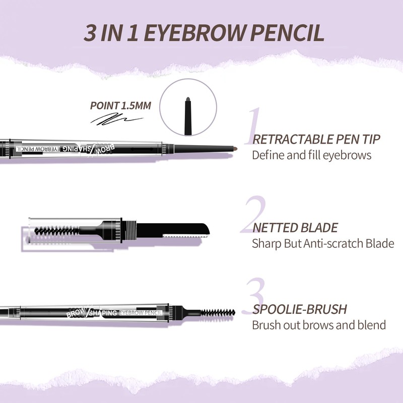- 3 in 1 Eyebrow Pen:A retractable eyebrow pencil with 1.5mm fine tip + spoolie brush and 1 eyebrow razor which is better for naturally defined brows absolutely meet your need of daily eyebrow makeup.