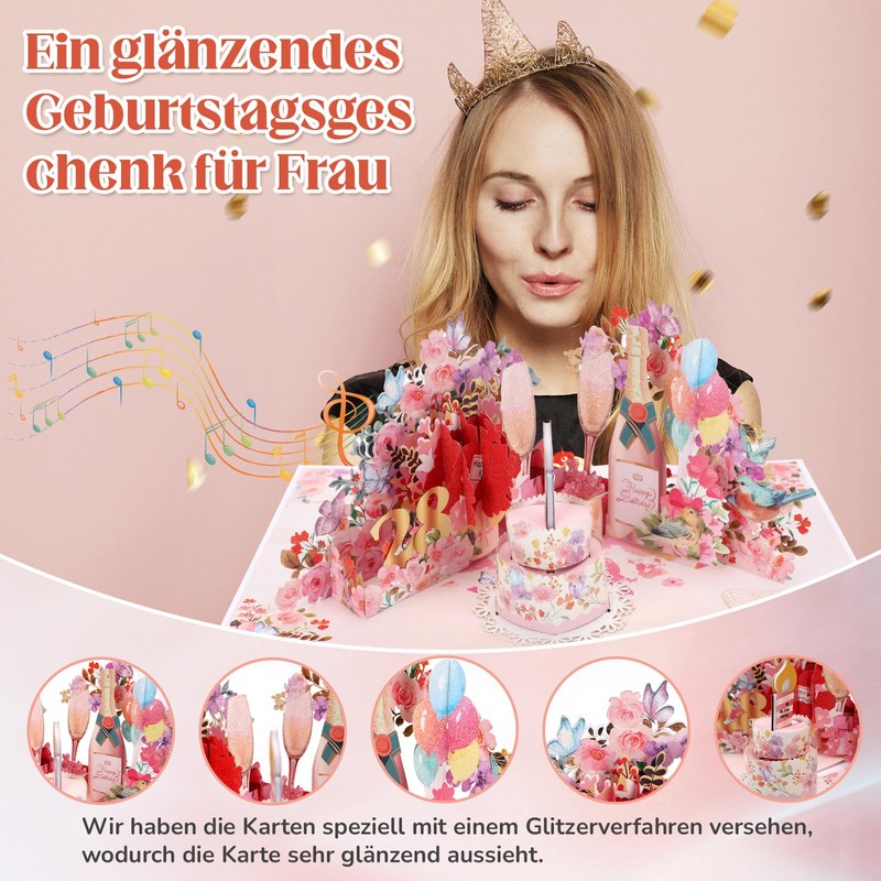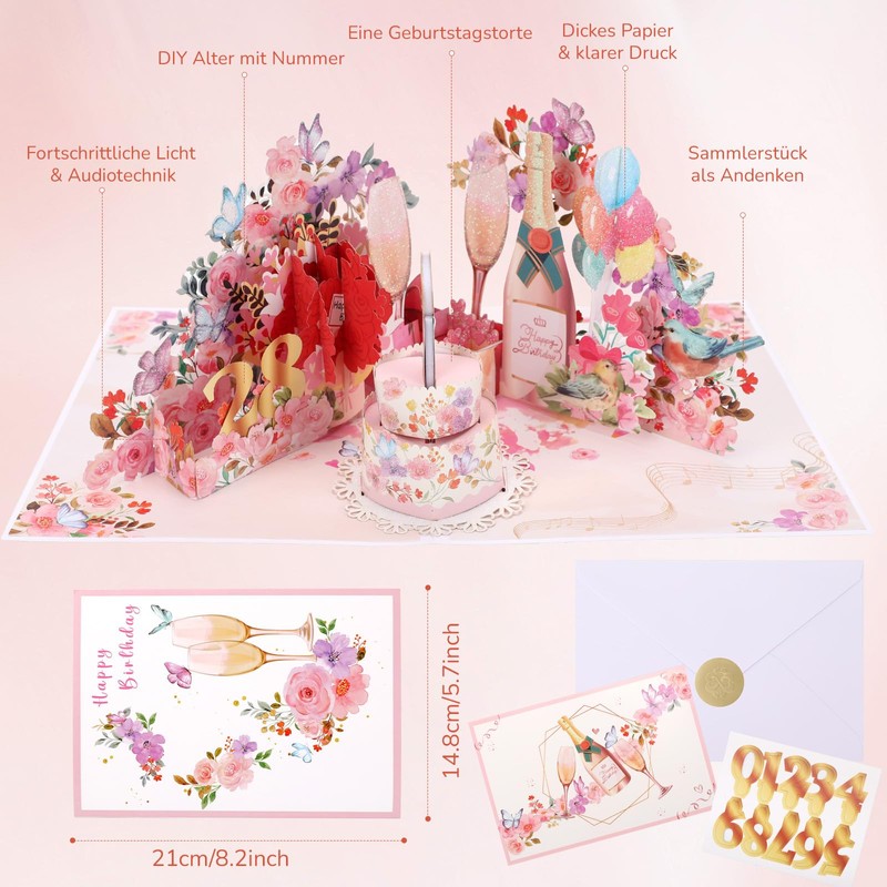 - Pop-Up Karte Geburtstag mit Musik & Licht: Diese 3D-Pop-up-Geburtstagskarte öffnet sich und enthüllt Champagner, Blumen, einen Schmetterling und einen Kuchen. Die Geburtstagsmusik ertönt und die bunten Lichter blinken im Takt der Musik. Wenn du die LED-Kerze auf dem Kuchen ausbläst, sagt sie "Happy Birthday".