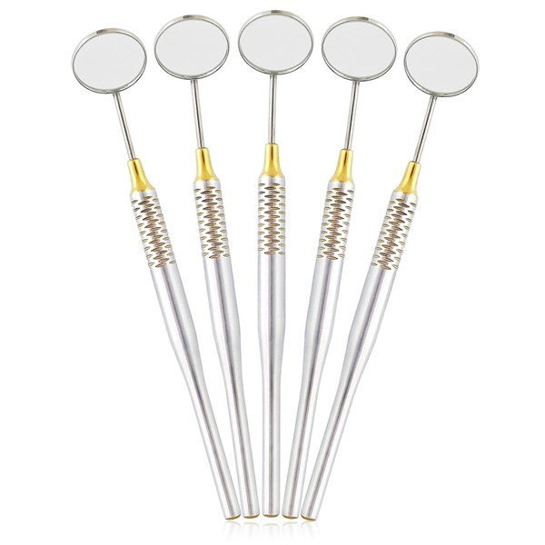 - ✔️ 5 Piece Dental Mouth Mirror Head #5 With 5 Stainless Steel Chrome Plated Gold Titanium Finish Handle Especially Designed Back End For Better Percussion While Diagnosing.