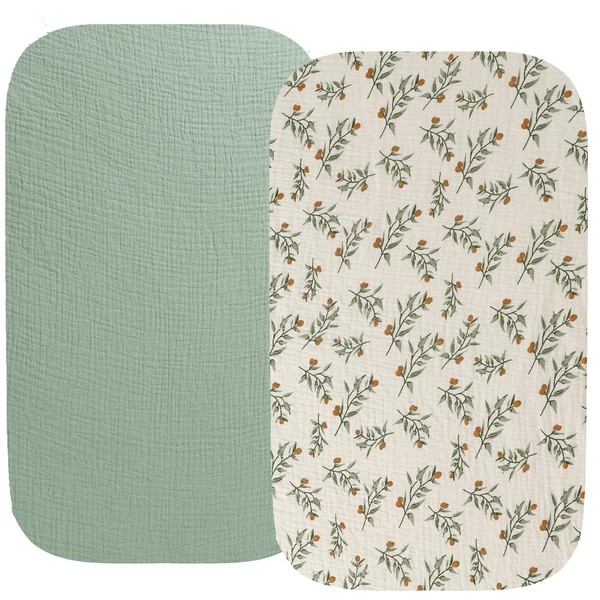 Muslin Bassinet Sheet Compatible with Maxi-COSI Iora,Swift Lightweight Portable Bassinet, AMKE Baby Bassinets, 2 Pack Cotton Stylish Boho Fitted Bassinet Sheets for Baby Roman Green & Botanical Leaf