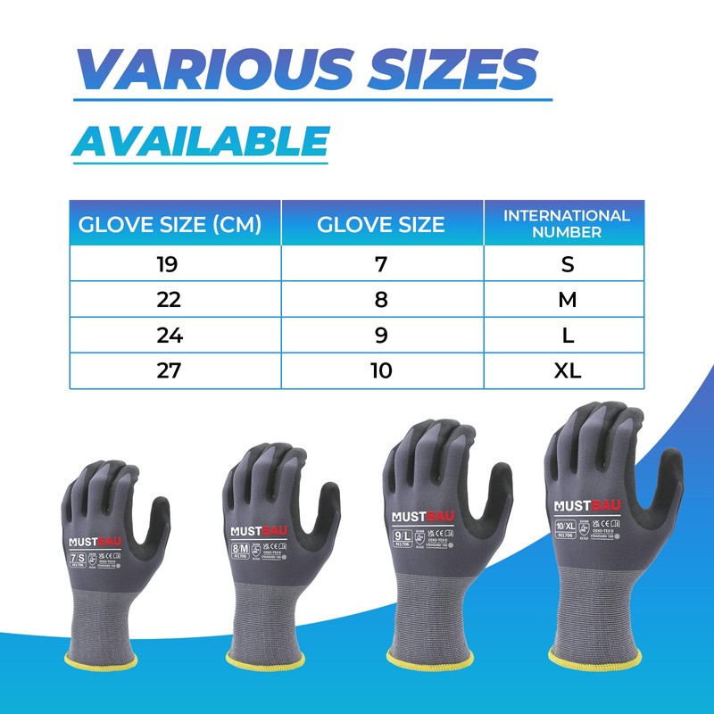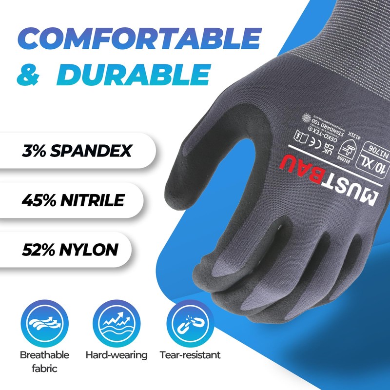 • Environmentally friendly materials: The Mustbau gloves are made of polyester and cotton, the palm of the glove has a polyurethane coating. They are waterproof, oil resistant, non-slip and environmentally friendly.