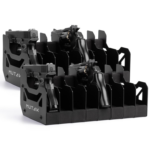- Portable & Anti-scratching: Mutak Pistol Rack better protect for your handgun. It is made of dense closed cell foam and PVC plates to keep pistols from banging each other and cushioned foam to sit them steadily in place.The cushioned foam ensures your firearms stay securely in place. The built-in handles on both sides make it easy to move the pistol rack in your daily life.