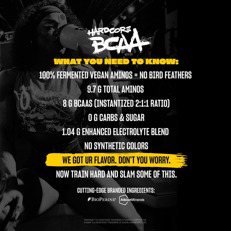 Slam Hardcore BCAA to take your training to the next level. Unlike your average pre/intra workout, Hardcore BCAA is designed for those who don't settle for mediocrity. Formulated with a 2:1:1 instantized ratio of BCAAs, this powerhouse supplement supports muscle recovery and helps you stay on top of your game. Whether you're using it intra- or post-workout, Hardcore BCAA helps protect muscle and keeps you anabolic. This BCAA blend is 100% vegan and fermented, free of any bird feathers or synthetic additives. With 9.7 grams of total amino acids, including 8 grams of BCAAs, you get the perfect combination of L-Leucine, L-Valine, and L-Isoleucine to support muscle recovery. Plus, with zero carbs, no sugar, and no artificial colors, you get pure, clean support with every serving. The formula also includes a 1.04g enhanced electrolyte blend to keep you hydrated and performing at your best. Developed in a government-licensed facility and lab-tested for quality and purity, Hardcore BCAA ensures that you receive the highest quality ingredients with every batch. This advanced BCAA supplement is perfect for those who push their limits and demand the best. Stay fueled, recover faster, and train harder. Hardcore BCAA is the choice for those who are serious about their fitness journey.