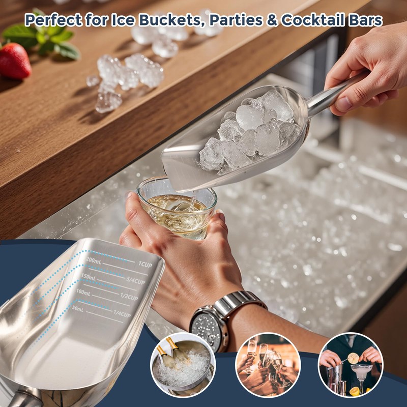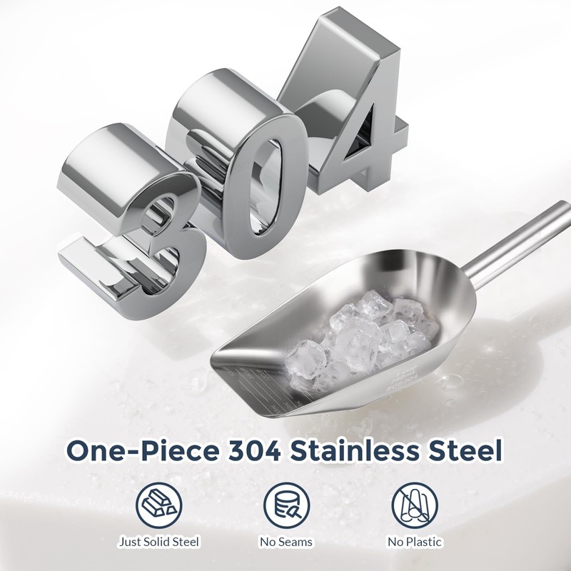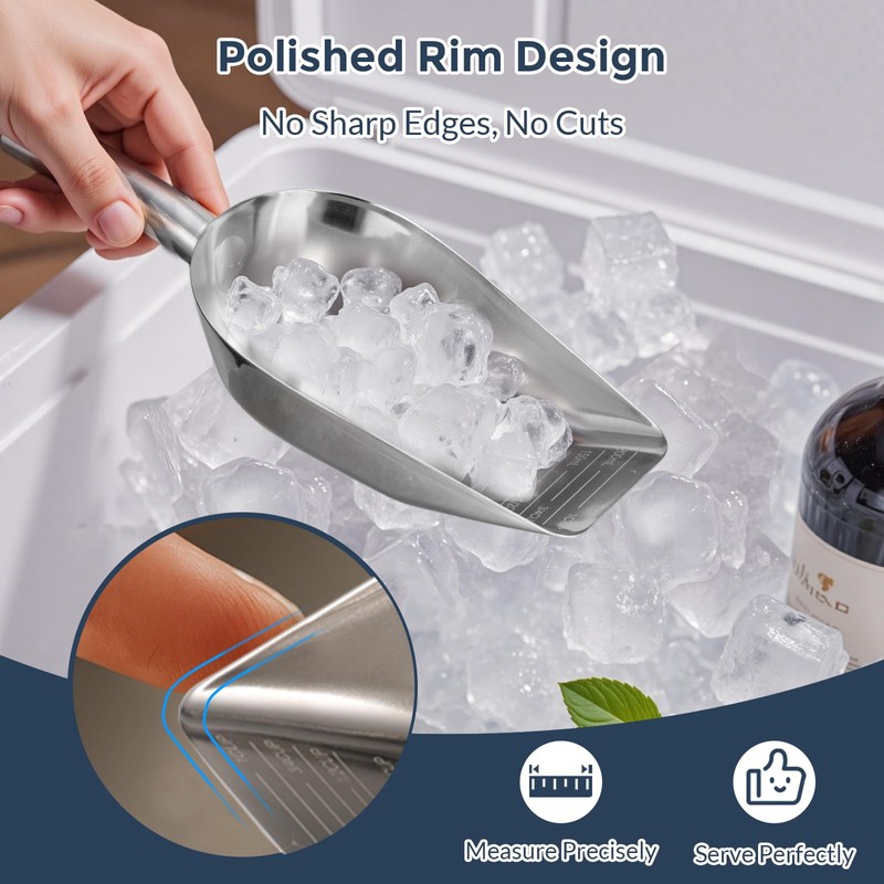 - Safe to use and easy to clean: The stainless steel scoop is mirror polished and the edges are smoothly polished. It does not stick easily and is easy to clean, preventing scratches to your hands or ice-making equipment during use. The scoop can be placed directly in the dishwasher for washing
