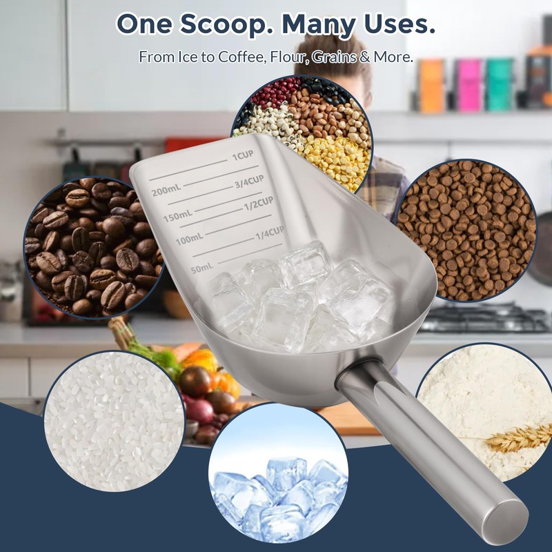 - Multi-purpose: The food scoop is not only suitable for ice cubes, but can also be used to measure pet food, rice, flour, soybeans, and other foods. It is a multi-purpose tool that can help you complete various cooking and baking tasks