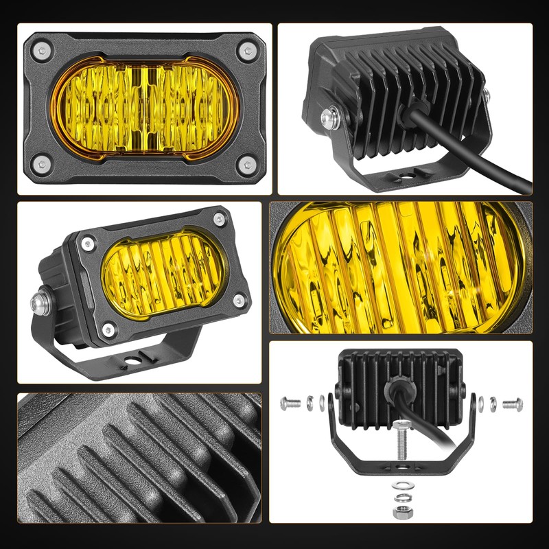 - PACKAGE INCLUDED : 2PCS 3 Inch Yellow Flood LED Pod Lights, Stainless Steel Adjustable Mounting Brackets, Hardware Kit. If you have any questions, please feel free to contact us, we'll respond quickly within 24 hours.