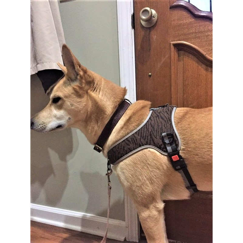 Muttitude Training Harness For Large And Small Dogs Keep your dog looking sharp and safe with our premium dog harnesses that come in a fun tiger stripe design. Made to fit medium and large sized dogs between 10 to 50 lbs with rambunctious personalities or a desire to always chase, this harness sports a secure front clip to curb pulling behaviors. This dog leash harness is also made to prevent choking, reduce neck strain, and freely move with your dog for optimal comfort. Soft and comfortable, our dog walking harness features four secure attachment clips and a breathable padded mesh material so your pup stays cool in all types of environments. Perfect for walks in the evening or late at night, this dog in training harness features reflective threading for clear visibility. Whether out for a walk, run, hike, or other outdoor activity, this comfy dog harness has an easy to adjust chest strap and a quick release lock and unlock buckle for additional safety and ease. For the best fit, measure around your dog’s neck and chest (behind the forelegs) and allow approximately 1 inch (2 - 3 cm) of wiggle room. Control your dog and get your no choke dog harness today for a more enjoyable outing without the pulling. Colors: Brown, Red, Orange, or Charcoal Four secure attachment clips: 1 regular rear clip, 1 front clip, and 2 side clips Small Size - Chest: 15.5 - 21.5”. Neck: 13.5”. Weight: 10-20 Lbs Medium Size - Chest: 17.5 - 23.5”. Neck: 15.5”. Weight: 20-28 Lbs Large Size - Chest: 20.5 - 25.5”. Neck: 19.5”. Weight: 25-40 Lbs. Extra Large Size – Chest: 23.5 - 29.5”. Neck: 23.5”. Weight: 40-55 Lbs For best results, please measure your dog around the chest and order according to chest size. Durable, safe, and comfortable, click Add To Cart to order your Muttitude dog harness today!