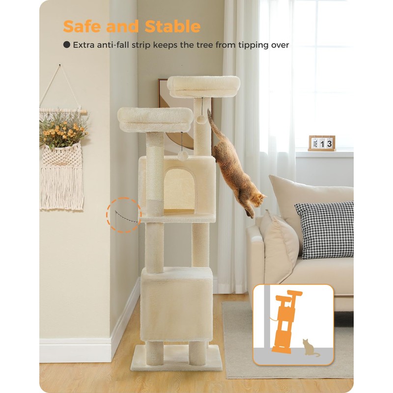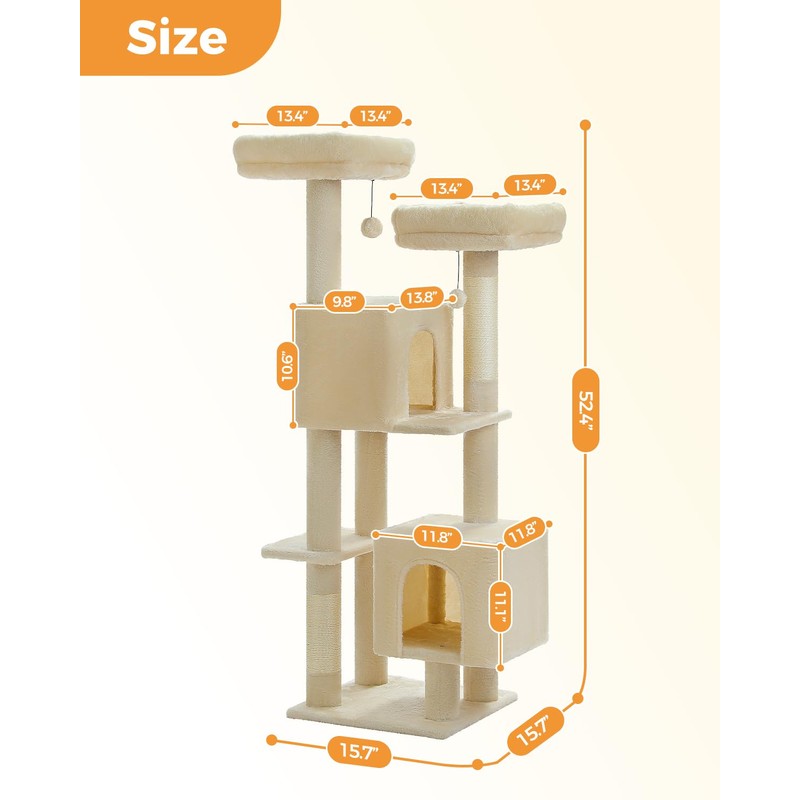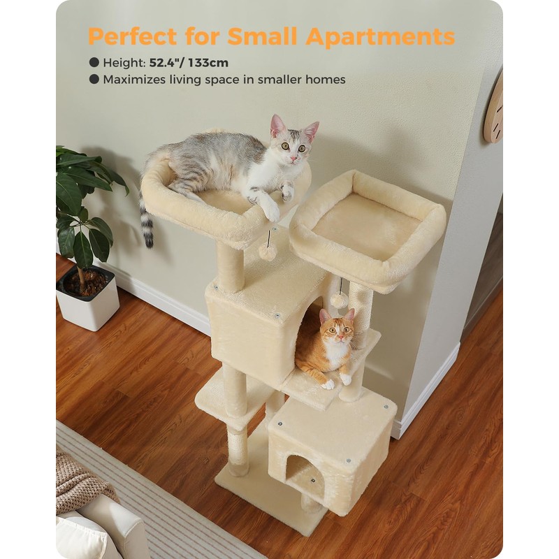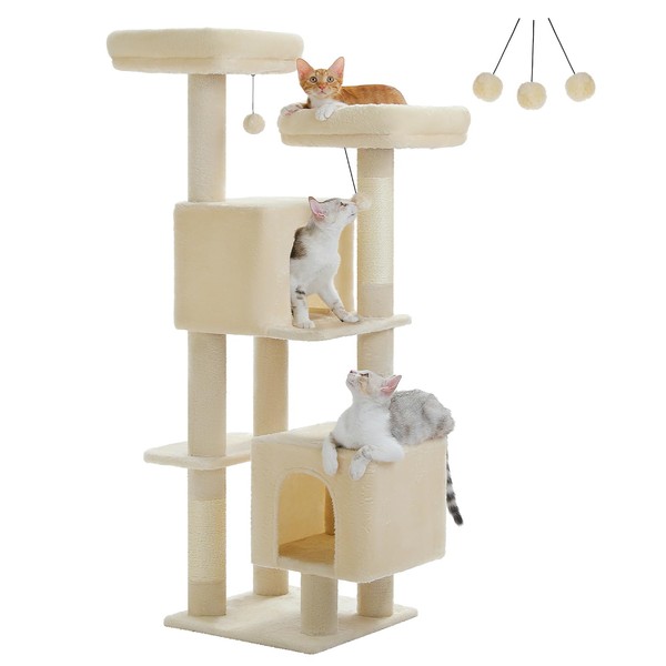 MUTTROS Cat Tree, 52.4" Multilevel Cat Tower for Indoor Cats, Plush Cat Tree House with 2 Padded Perches, 2 Condos & 2 Scratching Posts, Beige