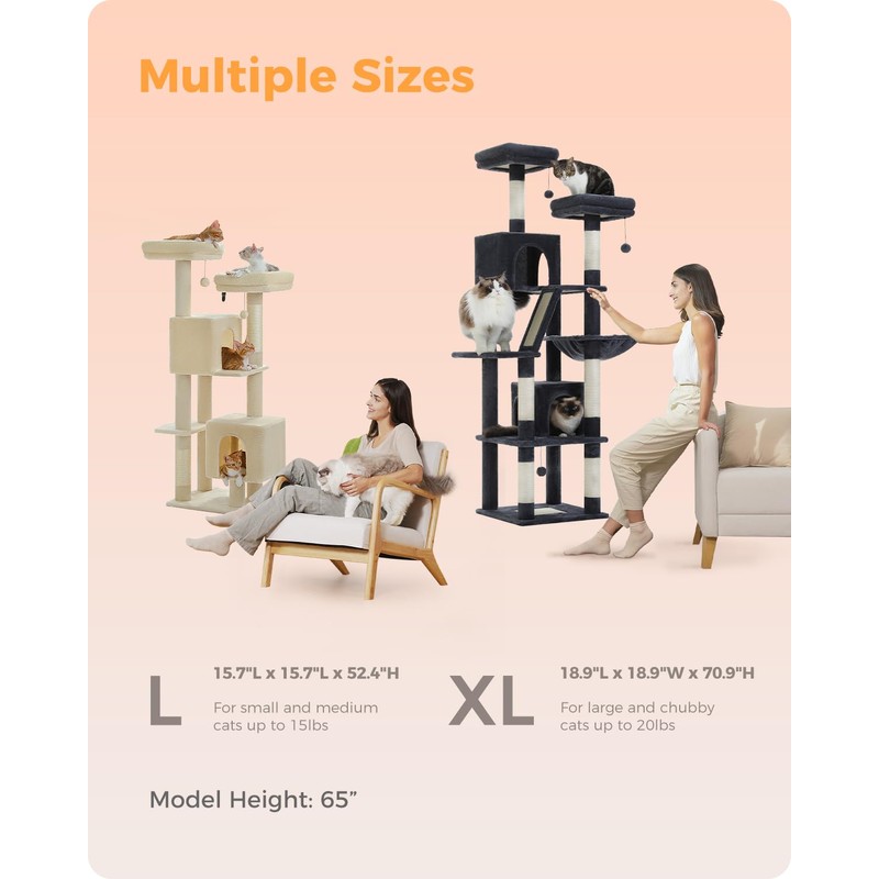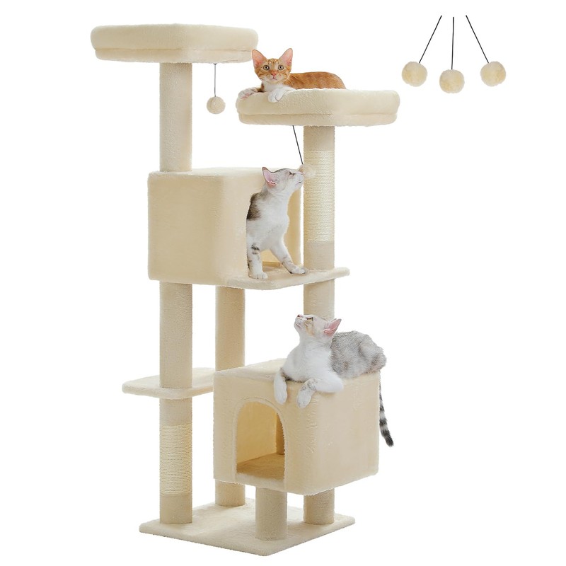 Our multi-level cat tree offers 2 top perches, 1 hammock, 2 comfortable condos, 6 scratching posts, 2 scratching boards, and 2 dangling pompoms.