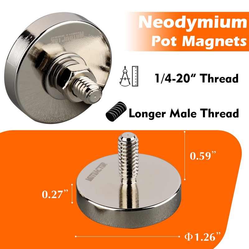 - Multi-Use of Power Magnet with Male Thread Stud:#1/4"-20 Male thread Stud, directly screw into the threaded hole of the fixed body or putting through a hole and fastening with a nut to attach any hardware assembly. Great for camera , video, display panel , automatic equipment, tools and machines