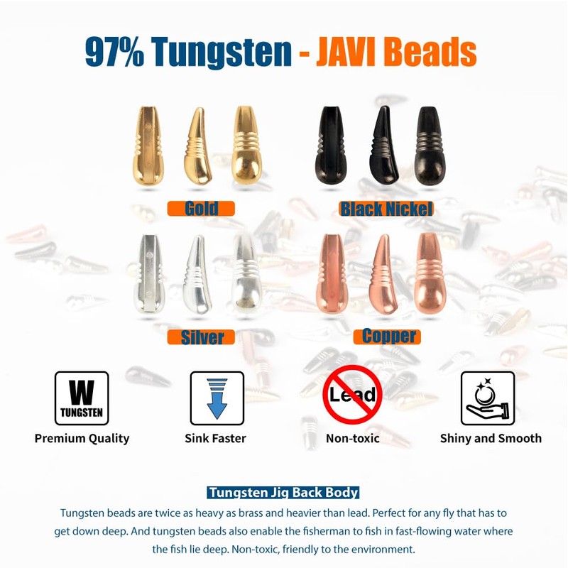 - 97% Tungsten: The javi tungsten bodies weigh up to 2/3 times as much as a classic tungsten bead of the same diameter, which allows you to reach the bottom even in strong current situations, presenting the fish with much more credible imitations. Tungsten javi bodies (jig back)are approx. 1.7x denser / heavier than lead, so your flies will get down deep