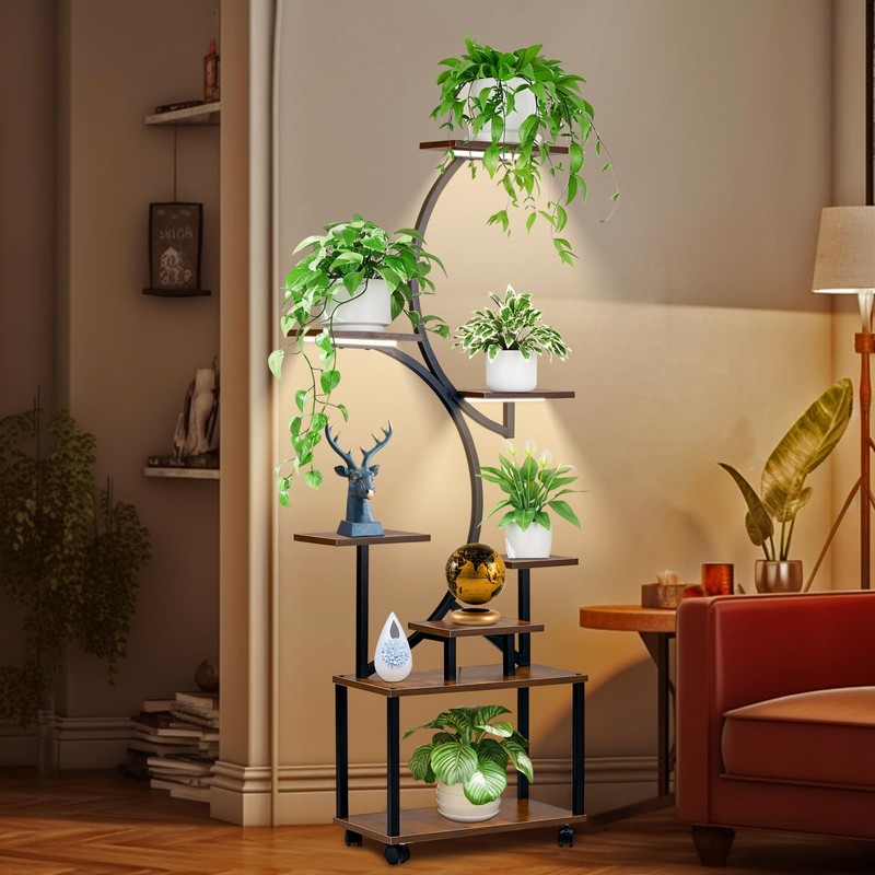 - 【Plant holder】This stand for plants indoor is equipped with 4 swivel wheels, allowing one person to easily move their position and decorate the space flexibly. It has 8 layers of different height brackets to display your favorite plants and flower pots, and can also be used as a multifunctional display rack to place crafts, photos, books, giving you an elegant and fashionable home mobile garden