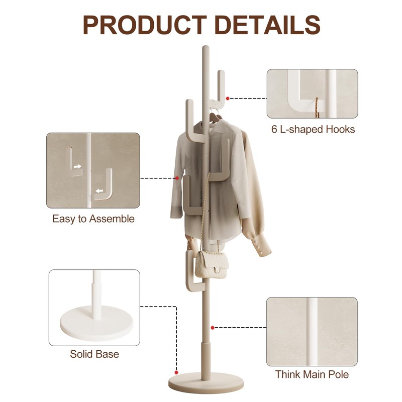 - 【HEIGHT-ADJUSTABLE DESIGN】Our wooden coat rack offers versatility with three height settings, achieved by simply adjusting the number of main rods. It accommodates coats, bags, ties, and more, catering to every family member's needs