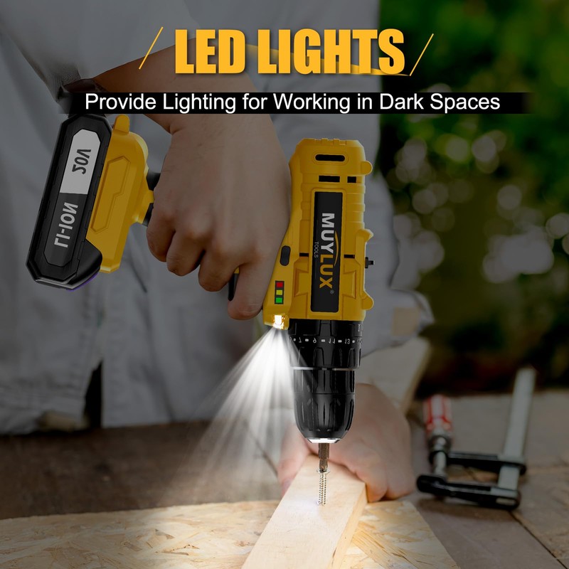 - Built-in LED Light for Precision: Illuminate your workspace with the LED-equipped cordless power drill. Ideal for tight spaces, this taladro inalámbrico or mini drill cordless makes precise drilling and fastening easier in low-light conditions.