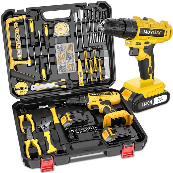 Muylux 148Pcs Cordless Drill Tool Kit Set, Power Drill Tool Box with 20V Battery Electric Drill Driver for Men Home, LED Household Combo Set with DIY Hand Taladros Kits