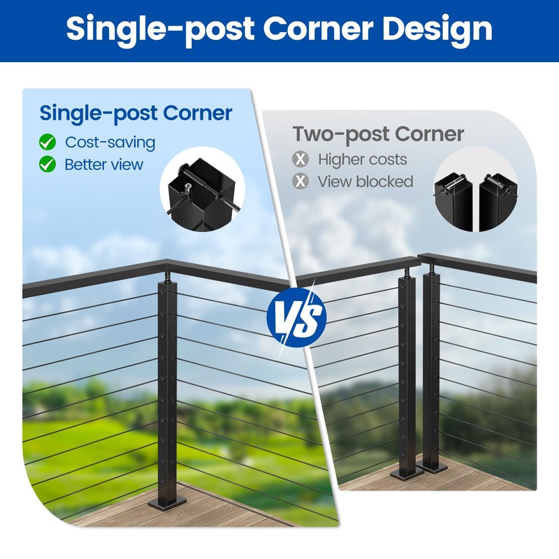 Muzata Black Corner Cable Railing Post 36 Inch 36"x2"x2" T-drilled One-Post C...