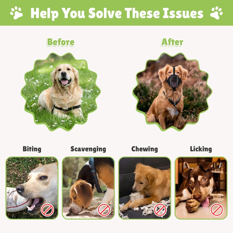 • Anti-chew muzzle: designed for medium and large dogs, it is made of adjustable soft mesh and breathable material that combines safety and comfort! Anti-chew design effectively prevents dogs from chewing on furniture, accidentally eating dangerous objects or fetching foreign objects to avoid gastrointestinal injury and damage to the home