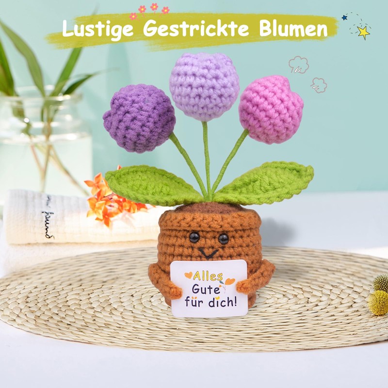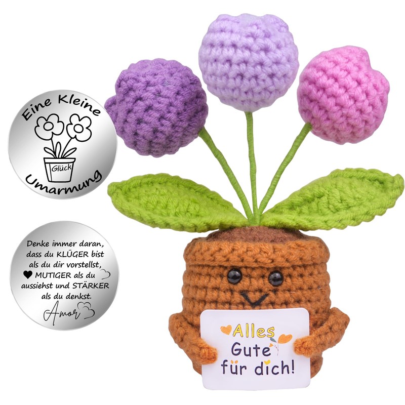 - 🌼 Handgefertigte gestrickte positive Blume: Diese charmante Häkelpflanze ist ca. 13x6 cm groß und wird von erfahrenen Kunsthandwerkern mit weichem Garn liebevoll hergestellt, um Glück zu bringen. Kleine Umarmung Glücksbringer (3cm) passen in Tasche und kann überall genommen werden.