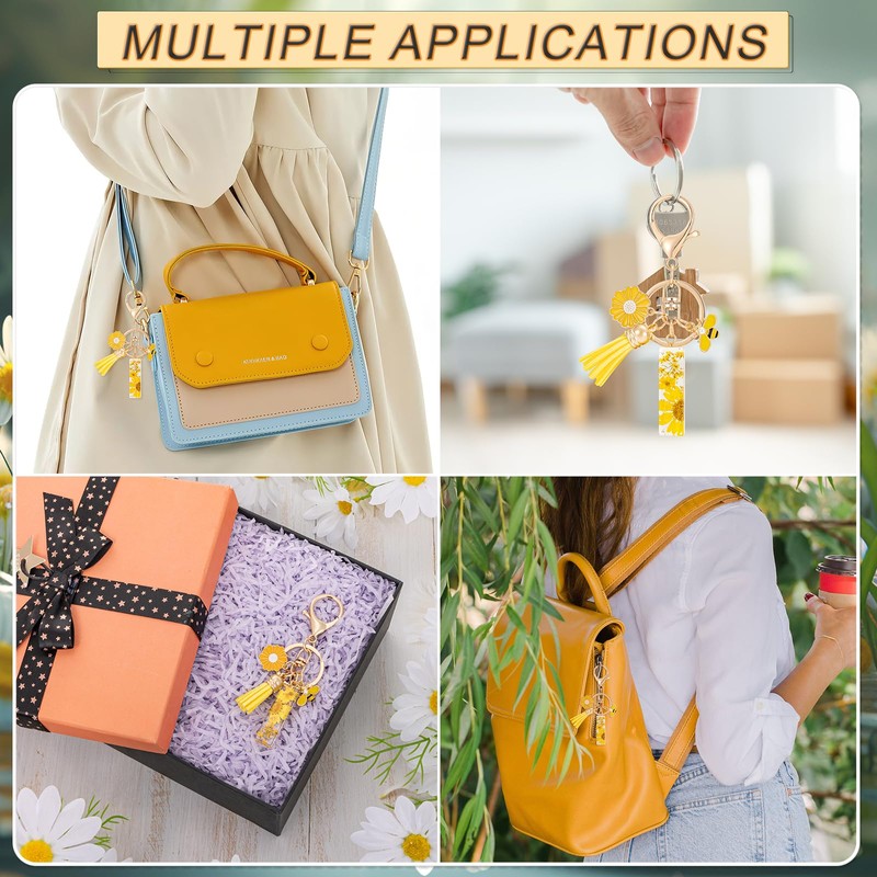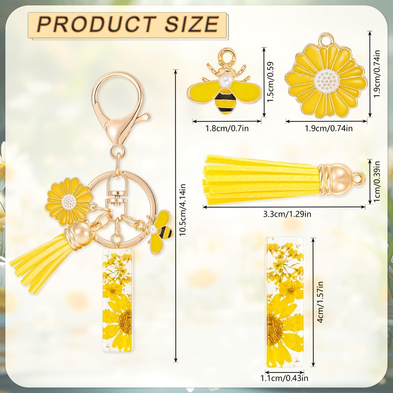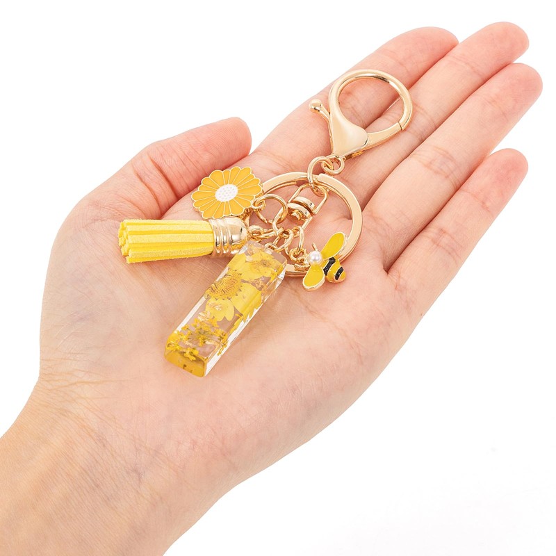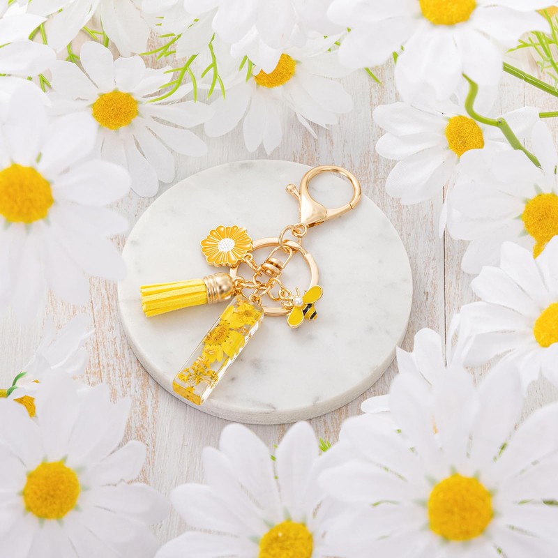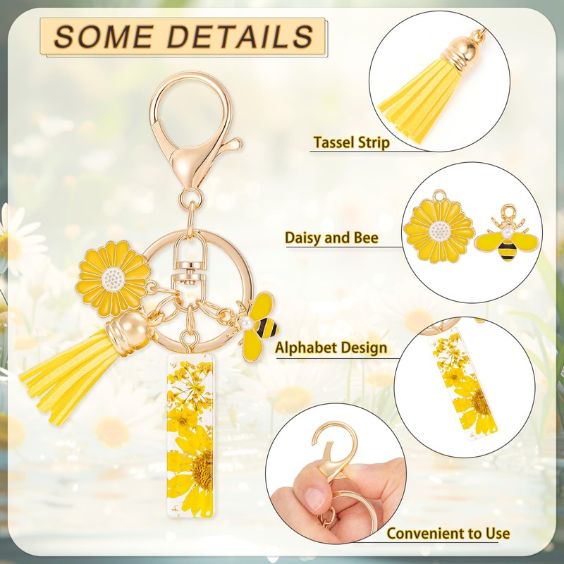 - Chic Design: The resin letters are embedded with yellow petals and gold foil. The alphabet keychain comes with a daisy bee tassel pendant to satisfy your DIY decorative needs. You can also remove it to change the location of the tassel.