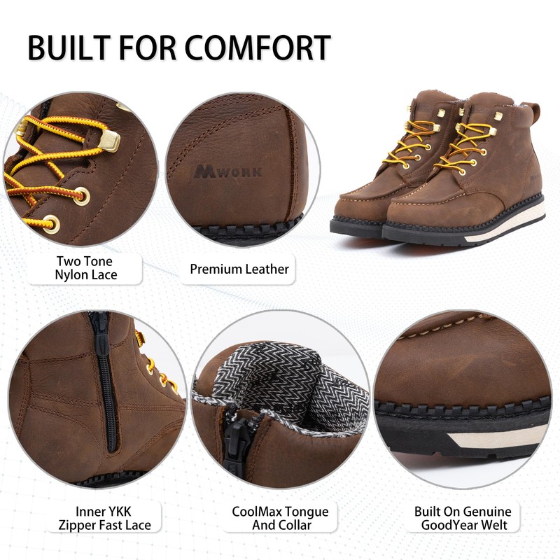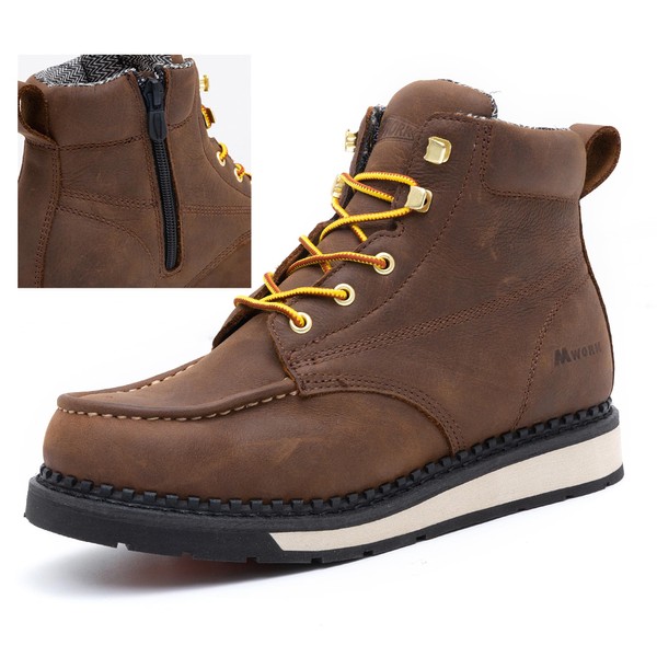 MWORK Men's 6 Inch Soft Moc Toe Work Boot, Premium Full-Grain Leather, Abrasion & Oil & Slip Toughest Wedge Sole, EH Rated, Arch Support Anti Fatigue,YKK Zipper Side