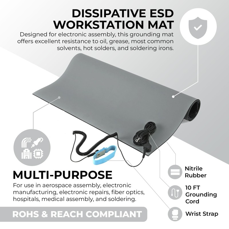 - Package: 1 PC ESD Mat; 1 PC Wrist Strap; 1 PC 10 FT Ground Cord