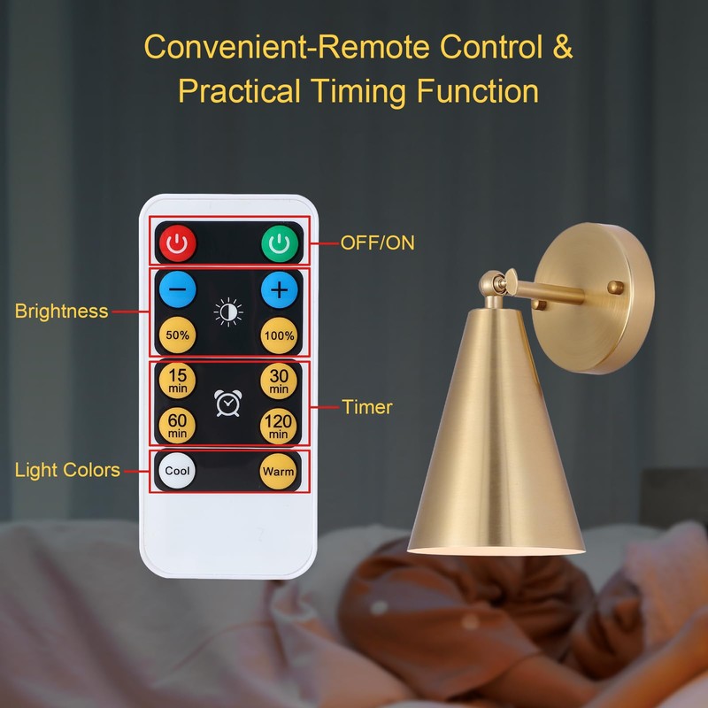 - 【2 Color Temperatures and Adjustable Brightness】This gold wall light offers two adjustable color temperatures: 3000K and 6000K, you can easily switch between these options using the remote control to create your preferred atmosphere. Or simply press the bulb shade to toggle the color temperature and turn the light on or off, as the wireless wall sconce also features push-button touch functionality. Additionally, the brightness of this Led wall light can be adjusted from 25% to 100%.