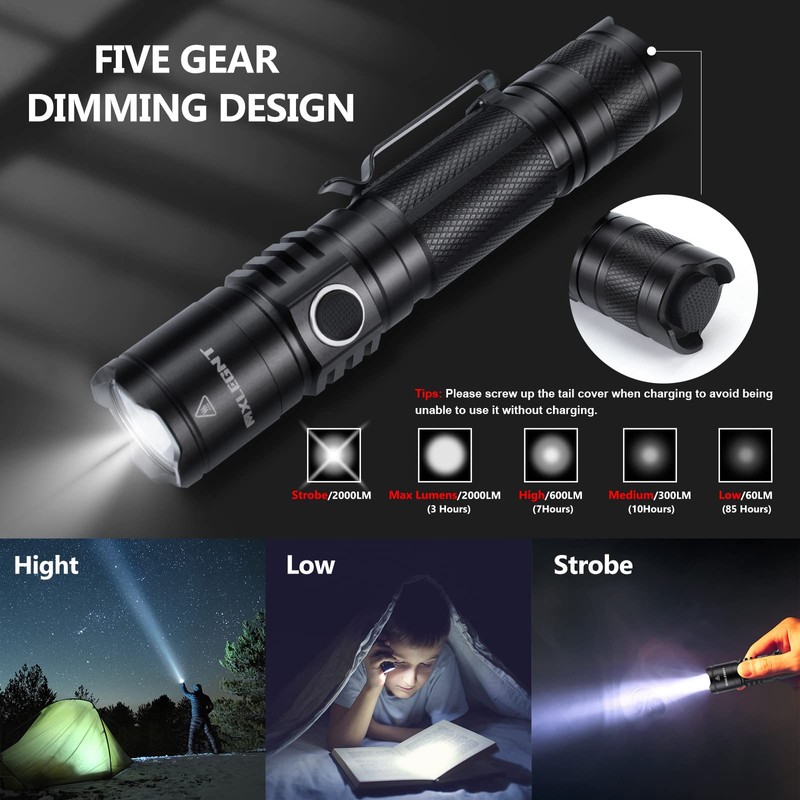 - [Brighter and Farther] 2000LM maximum output Handheld tactical flashlight, 18623cd light intensity and 850 feet ultra-long irradiation distance make the high lumens LED flashlights can easily light up every conner in darkness.