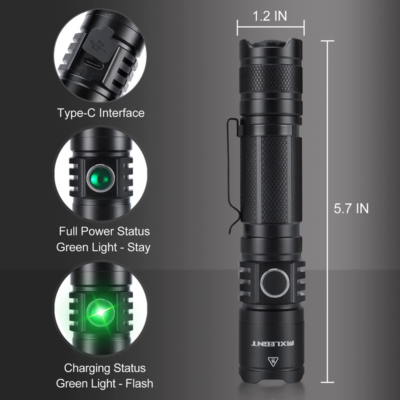 - [USB Charging and Longer Lasting Time] USB charging port, bright led flashlight can be charged via a power bank, computer, or car charger. The camping flashlight switch button will flash green during charging, and will stay green when fully charged. Powerful 4800mAh 21700 battery makes the outdoor flashlights can work up to 85 hours in low brightness mode.