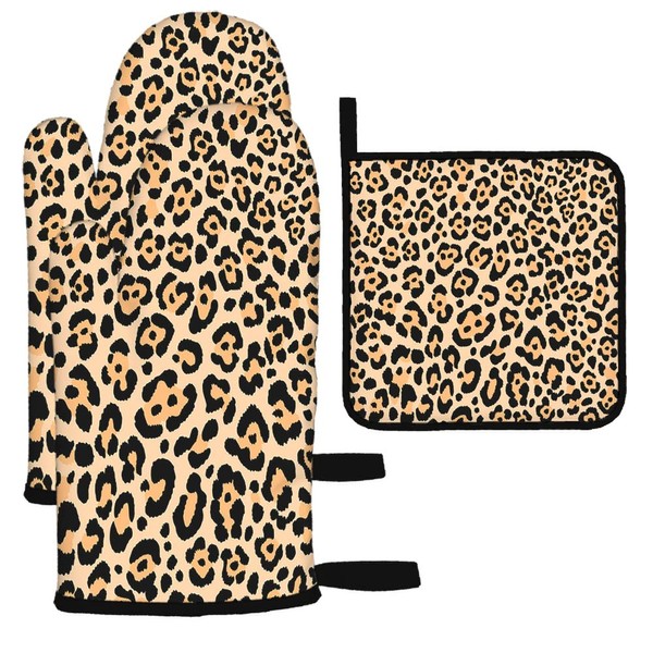 Mxocom Animal Print Leopard Skin Oven Mitts and Pot Holders Sets of 3 Seamless Pattern Wild Safari Background BBQ Gloves for Kitchen,Cooking,Baking,Grilling Resistant Hot Pads for Women