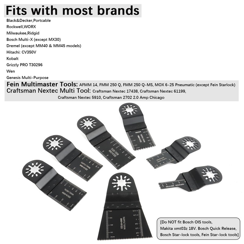 Multifunktionswerkzeug zubeh?r verwendet ein universelles Schnittstellensystem, das mit mehr als 95% der auf dem Markt befindlichen Vibrationswerkzeuge kompatibel ist: Black&Decker, Portcable, Rockwell, WORX, Milwaukee, Ridgid, Bosch Multi-X (except MX30), Dremel (except MM40 & MM45 models), Fein Multimaster Tools (AFMM 14, FMM 250 Q, FMM 250 Q-MS, MOX 6-25 Pneumatic (except Fein Starlock) ), Craftsman Nextec Multi Tool (Craftsman Nextec 17438, Craftsman Nextec 61199, Craftsman Nextec 5910, Craftsman 2702 2.0 Amp), Chicago, Hitachi CV350V, Kobalt, Grizzly PRO T30296, Wen, Genesis Multi-Purpose