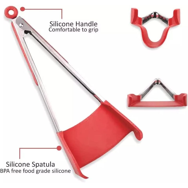 - PREMIUM MATERIAL: This silicon tong spatula have made of a durable stainless steel handle which is corrosion free and the silicone cradle won't let scratch your cooking utensils. The material used in the spatula and tongs in one is heat resistant up to 400 degrees.