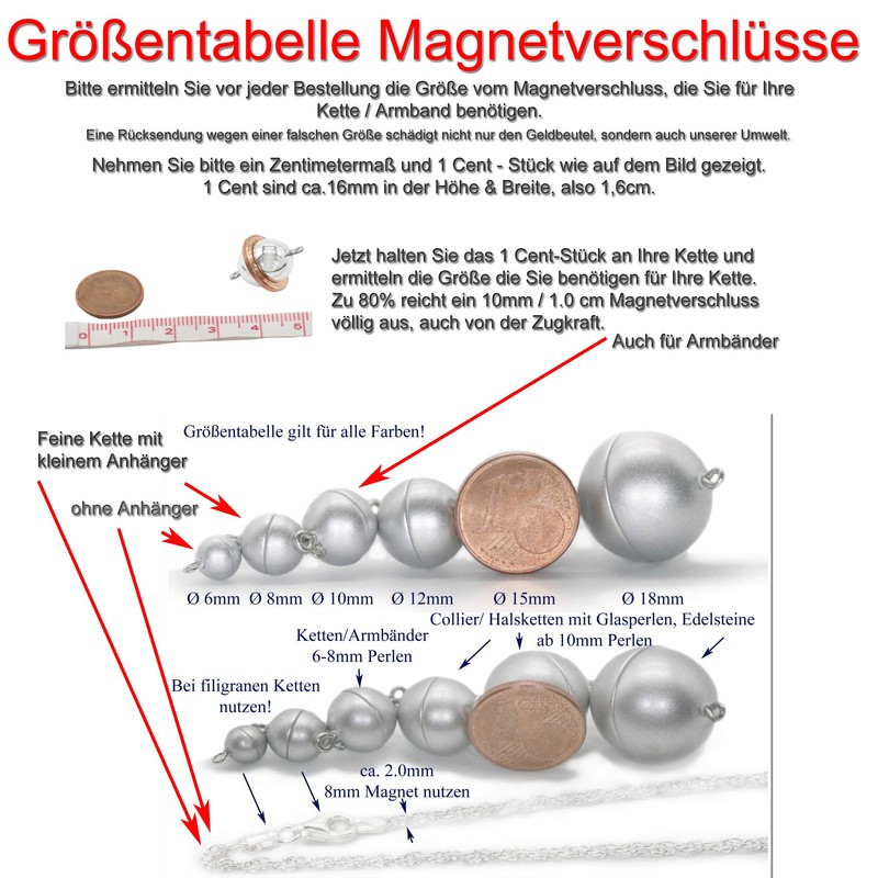 - Product: magnetic clasp with carabiner + carabiner for delicate chains up to 1.5 mm. - Additional variants: magnet with closed or open eyelet or carabiner + extension chain. Please note: Please check the size before ordering. A 2 cent piece corresponds in height and width to the 18 mm clasp. A 1 cent piece corresponds in height and width approx. the 15 mm clasp. Delicate chains please use 6-8 mm. For normal bracelets, the 10 mm clasp is sufficient.