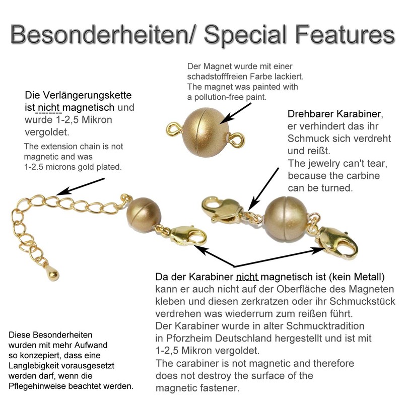 - Attention: when you put the magnetic clasp between the chain, slide the magnetic closure on, do not pull the chain! It is a power magnet that can make your chain tear. Always use the same size for e.g. 8-12 mm freshwater pearls with the magnetic closure.