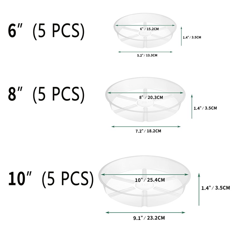 - VITAL STATISTICS - The 15-pack contains 3 saucers sizes - 6”, 8” and 10” at the top, and 5.2”, 7.2” and 9.1” at the base of the saucers, so make sure you get the right sizes for your plant pots!