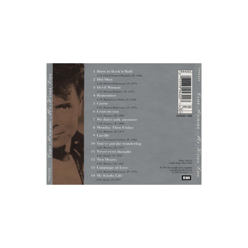 Catalogue number 7994322 on the EMI label with a 10 page (20 side) frnt insert lyric booklet and the following tracks: 1> Born To Rock 'n' Roll [3:54], 2> Hot Shot [3:38], 3> Devil Woman [3:53], 4> Remember [4:18], 5> Carrie [3:55], 6> Lean On You [4:12], 7> We Don't Talk Anymore [5:18], 8> Monday Thru Friday [3:54], 9> Lucille [3:42], 10> You Got Me Wondering [3:36], 11> Never Even Thought [4:02], 12> Two Hearts [4:06], 13> Language Of Love [4:30], 14> My Kinda Life [3:36].
