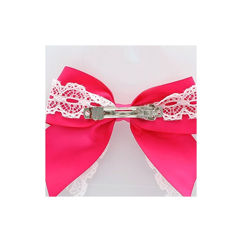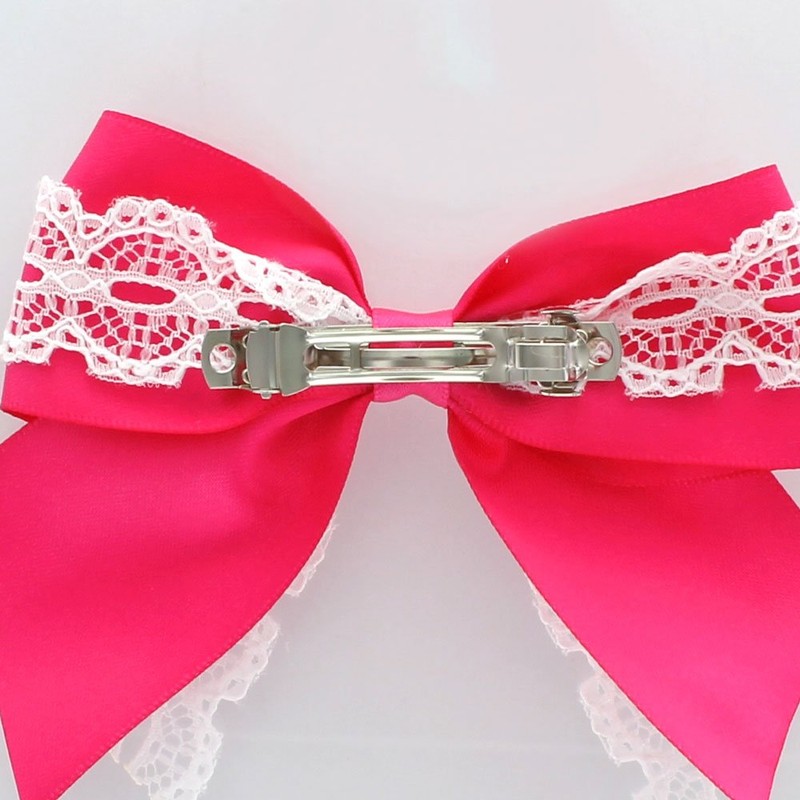 Our satin and lace hair-bow comes attached to a french barrette hair clip.