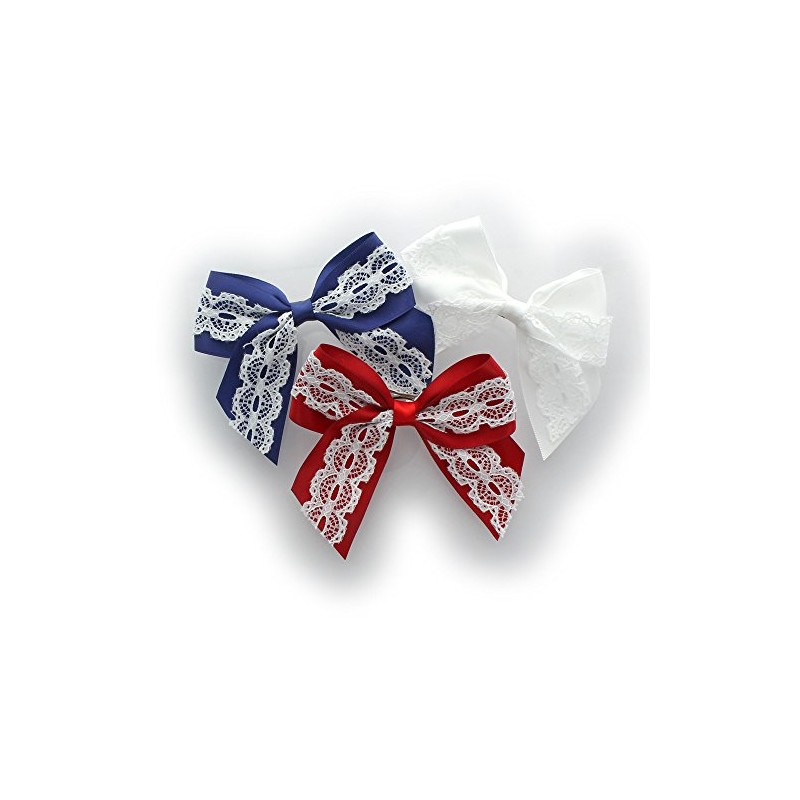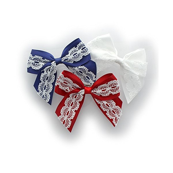 My Lello Medium 4" Girls Hair-Bow Barrette Satin & Lace Mixed Variety 3 Pack Navy/White/Red