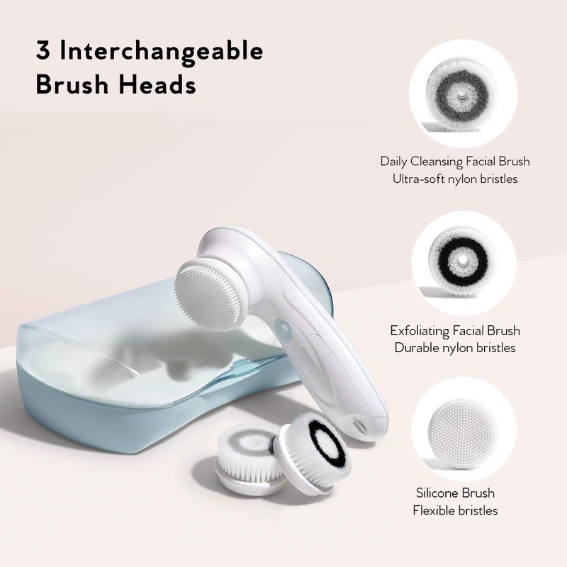 - 3 INTERCHANGEABLE BRUSH HEADS: The Ultimate Skin Spa kit includes 1 Daily Cleansing Facial Brush with ultra-soft nylon bristles to gently lift away dead skin cells for naturally glowing skin. 1 Exfoliating Facial Brush made of durable nylon bristles to remove deep-seated dirt and debris from the lower layers of skin. 1 Silicone Brush with flexible bristles, great for cleansing dry and sensitive skin and providing exfoliation for all skin types.