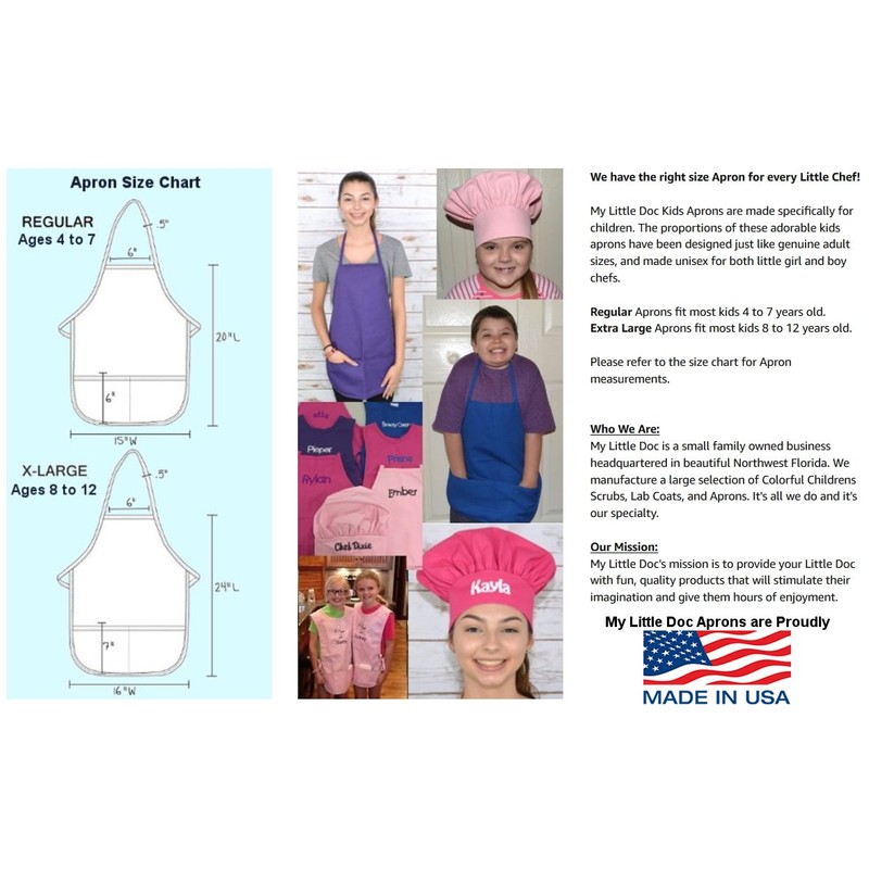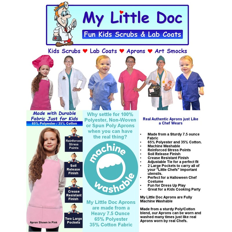 My Little Doc Brand Kids Aprons are Authentic Aprons just like a real Chef wears. These Aprons are made from a high quality heavy 7.5 ounce Poly/Cotton Twill fabric containing 65% Polyester/35% Cotton and are fully Machine Washable. These Aprons include a Soil Release and Crease Resistant Finish with Reinforced Stress Points. They have classic Apron styling with two front pockets and an adjustable tie in the back. Regular fits Kids Ages 4 to 7 years, Extra Large fits Kids 8 to 12 years.