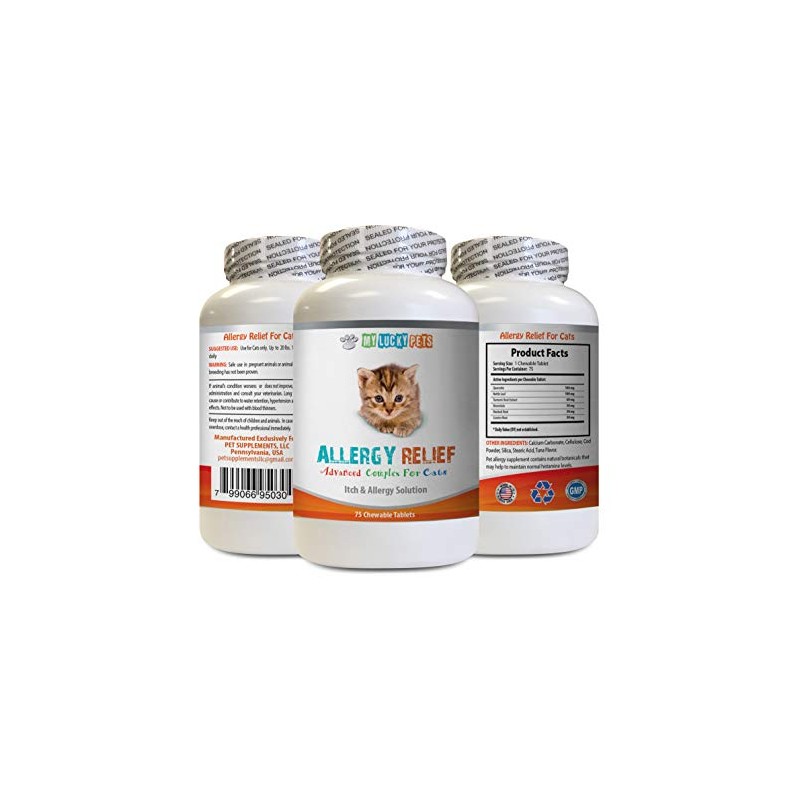 - CAT ALLERGY RELIEF: Allergies can present as a variety of symptoms, but in cats, the most common symptoms occur as skin irritations: itching, scratching, and gnawing at the skin. One of the best solutions to this problem is our Allergy Relief supplement. It holds powerful and key ingredients for your cats allergy symptoms.