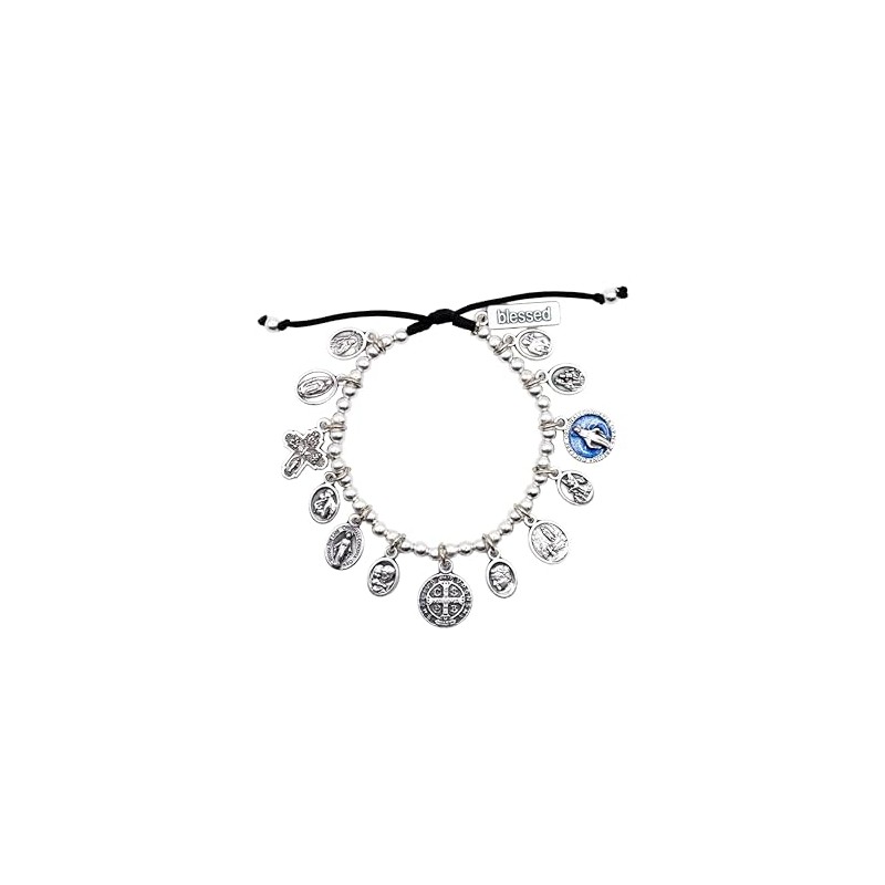 - 13 silver-tone double-sided saint medals, silver-tone beads, and our signature "blessed" tag.