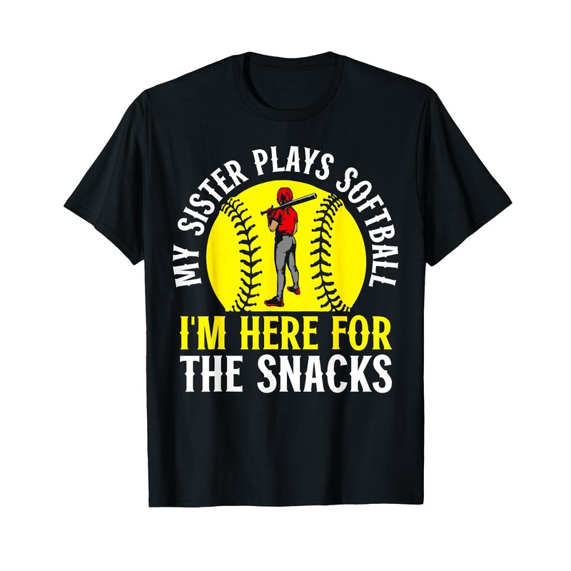 • My Sister Plays Softball I'm Here For The Snacks. Funny design for siblings of softball lovers, featuring a softball ball graphic with a softball player silhouette.