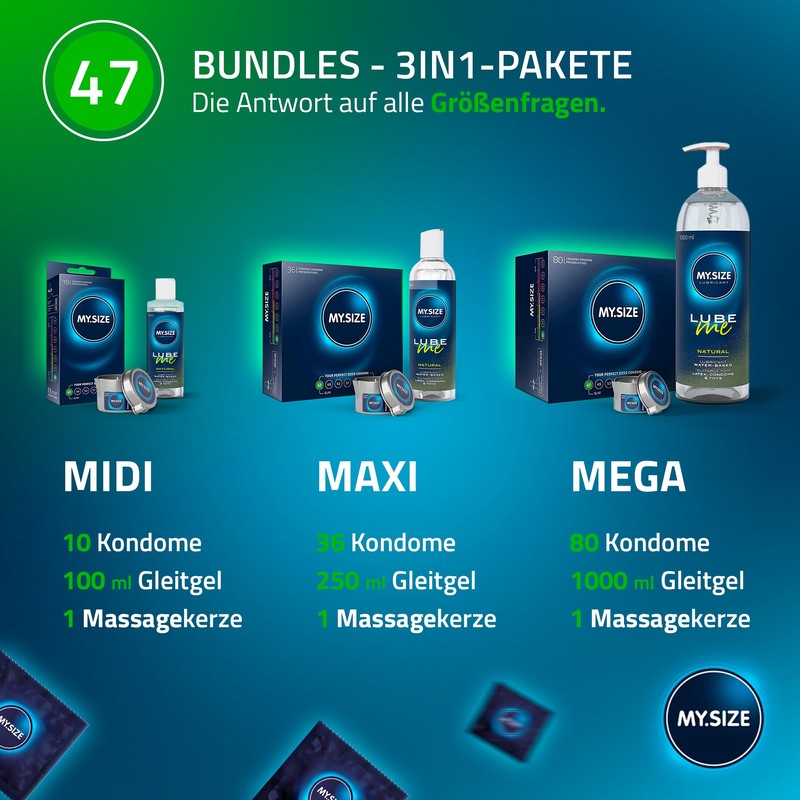 - It also increases safety during use. These 47mm condoms are tighter condoms with the following dimensions: Nominal width: 47 mm. For circumference: up to 10 cm. Length: 160 mm. Condoms features: Flavour: Neutral. Lubricant: normal Colour: Transparent. Texture: smooth. Size: tightener Nominal width: 47 mm. Thickness: Regular. 2 pieces in one pack. 36. Brand: MySize